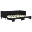 Ta 2 v 1 izvlečna dnevna postelja, ki služi kot kavč in postelja, je praktičen in privlačen dodatek za vašo dnevno sobo ali spalnico. Vsestranska dnevna postelja: Raztegljiva postelja čez dan deluje kot kavč, ponoči pa se z izvlečenim ležiščem zlahka spremeni v zakonsko posteljo, kar je priročna rešitev za sprejemanje gostov in maksimalno povečanje prostora.Mehak žamet in trdna konstrukcija: Ta dnevna postelja ima trpežen okvir iz lesa in kovine ter je oblazinjena z mehkim in udobnim žametom.Sodobno oblikovanje: Kavč postelja ima sodoben dizajn, ki ga odlikujejo čiste linije, minimalističen videz in naravna svetloba, vašim notranjim prostorom pa bo dodal sodoben stil! Dobro je vedeti:Vzmetnice niso priložene tej postelji. Ponujamo različno izbiro ležišč. V naši trgovini si lahko ogledate ustrezne vzmetnice.Barva: ČrnaMaterial: Žamet (100% poliester), kovina, trden lesMaterial letvic: Vezan lesMaterial polnila: PenaDimenzije (neraztegnjena): 213 x 100 x 68 cm (D x Š x V)Dimenzije (raztegnjena): 213 x 192,5 x 68 cm (D x Š x V)Višina naslonjal za roke, od tal: 68 cmVišina nog: 15 cmVelikost primerne vzmetnice: 90 x 190 cm (Š x D)Potrebno: 2 x vzmetnica (ni vključena)Potrebno sestavljanje: Da 3196706
