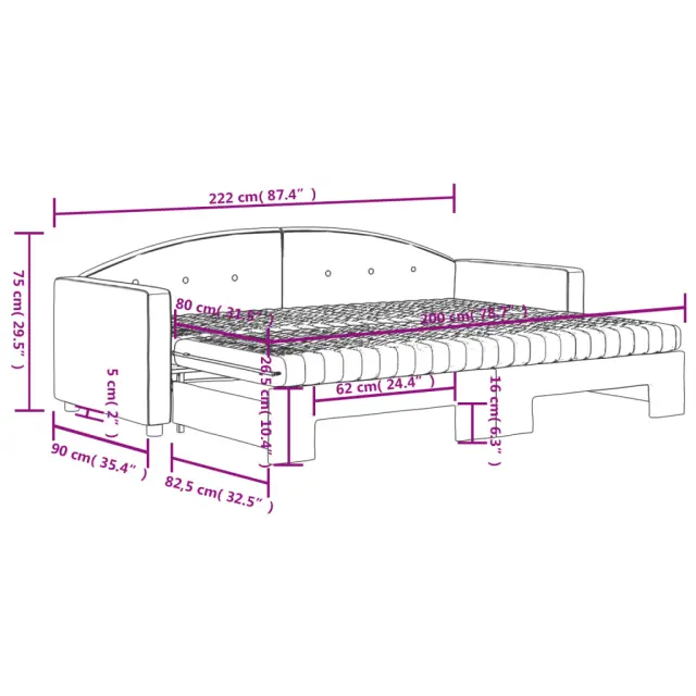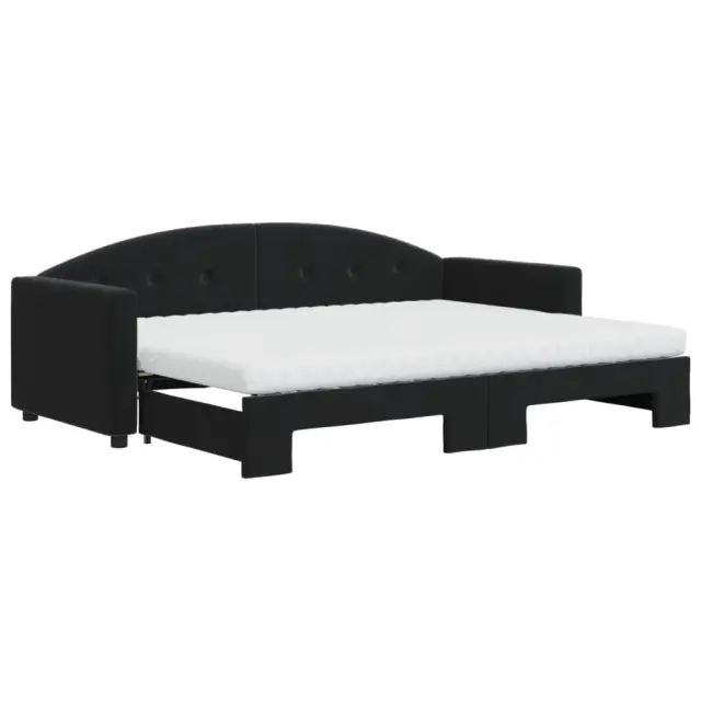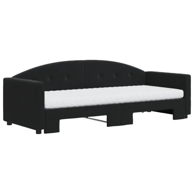 Ta 2 v 1 izvlečna dnevna postelja z vzmetnicami, ki služi kot kavč in postelja, je praktičen in privlačen dodatek za vašo dnevno sobo ali spalnico. Vsestranska dnevna postelja: Raztegljiva postelja čez dan deluje kot kavč, ponoči pa se z izvlečenim ležiščem zlahka spremeni v zakonsko posteljo, kar je priročna rešitev za sprejemanje gostov in maksimalno povečanje prostora.Udobna penasta vzmetnica: Ta postelja je opremljena z dvema vzmetnicama iz pene za največjo podporo in optimalno udobje. Mehak žamet in trdna konstrukcija: Ta dnevna postelja ima trpežen okvir iz lesa in kovine ter je oblazinjena z mehkim in udobnim žametom.Barva: ČrnaMaterial: Žamet (100% poliester), kovina, trden lesMaterial letvic: Vezan lesMaterial polnila: Pena Material prevleke vzmetnice: Kosmatena pleteninaDimenzije (neraztegnjena): 222 x 90 x 75 cm (D x Š x V)Dimenzije (raztegnjena): 222 x 172,5 x 75 cm (D x Š x V)Dimenzije vzmetnice iz pene (vsaka): 80 x 200 x 10 cm (Š x D x D)Višina naslonjala za roke, merjena od tal: 58 cmVišina nog: 5 cmPotrebno sestavljanje: DaPaket vsebuje:1 x Izvlečna dnevna postelja 2 x Vzmetnica iz pene 3197322