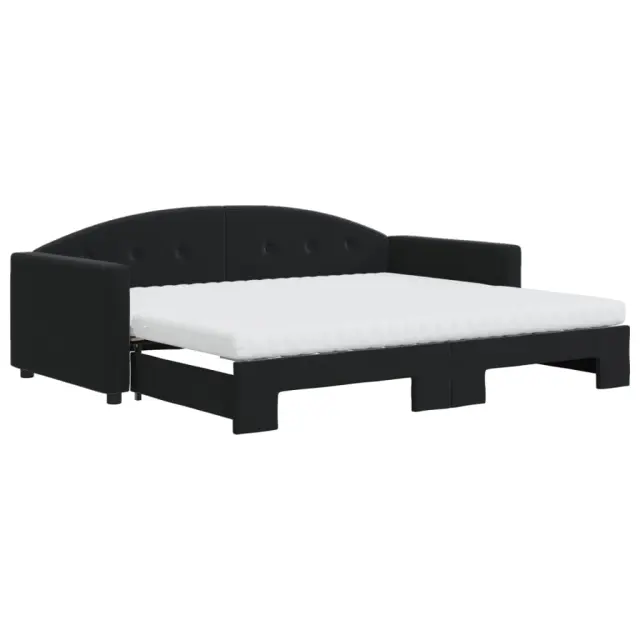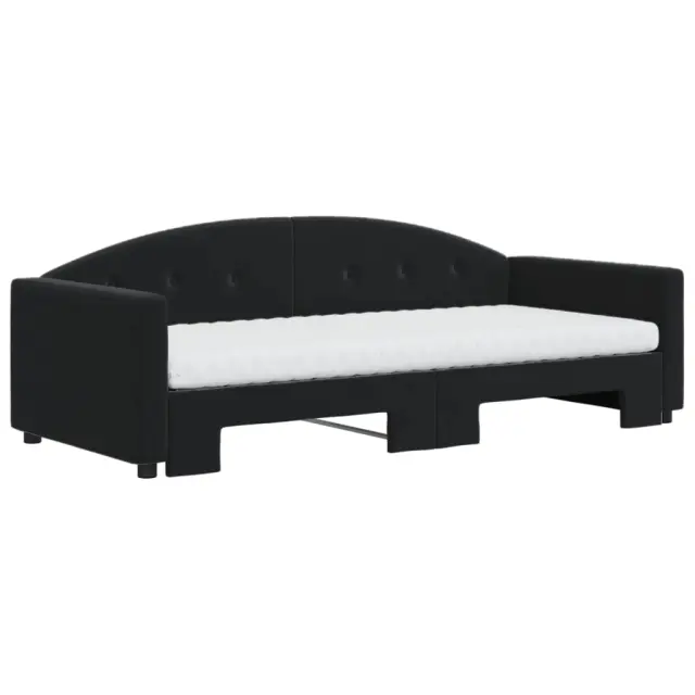 Ta 2 v 1 izvlečna dnevna postelja z vzmetnicami, ki služi kot kavč in postelja, je praktičen in privlačen dodatek za vašo dnevno sobo ali spalnico. Vsestranska dnevna postelja: Raztegljiva postelja čez dan deluje kot kavč, ponoči pa se z izvlečenim ležiščem zlahka spremeni v zakonsko posteljo, kar je priročna rešitev za sprejemanje gostov in maksimalno povečanje prostora.Udobna penasta vzmetnica: Ta postelja je opremljena z dvema vzmetnicama iz pene za največjo podporo in optimalno udobje. Mehak žamet in trdna konstrukcija: Ta dnevna postelja ima trpežen okvir iz lesa in kovine ter je oblazinjena z mehkim in udobnim žametom.Barva: ČrnaMaterial: Žamet (100% poliester), kovina, trden lesMaterial letvic: Vezan lesMaterial polnila: Pena Material prevleke vzmetnice: Kosmatena pleteninaDimenzije (neraztegnjena): 222 x 100 x 75 cm (D x Š x V)Dimenzije (raztegnjena): 222 x 192,5 x 75 cm (D x Š x V)Dimenzije vzmetnice iz pene (vsaka): 90 x 200 x 10 cm (Š x D x D)Višina naslonjala za roke, merjena od tal: 58 cmVišina nog: 5 cmPotrebno sestavljanje: DaPaket vsebuje:1 x Izvlečna dnevna postelja 2 x Vzmetnica iz pene 3197329