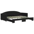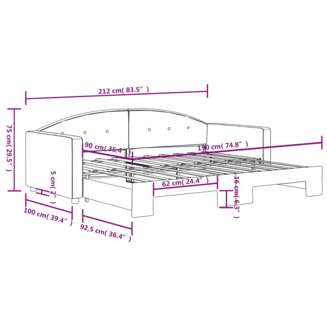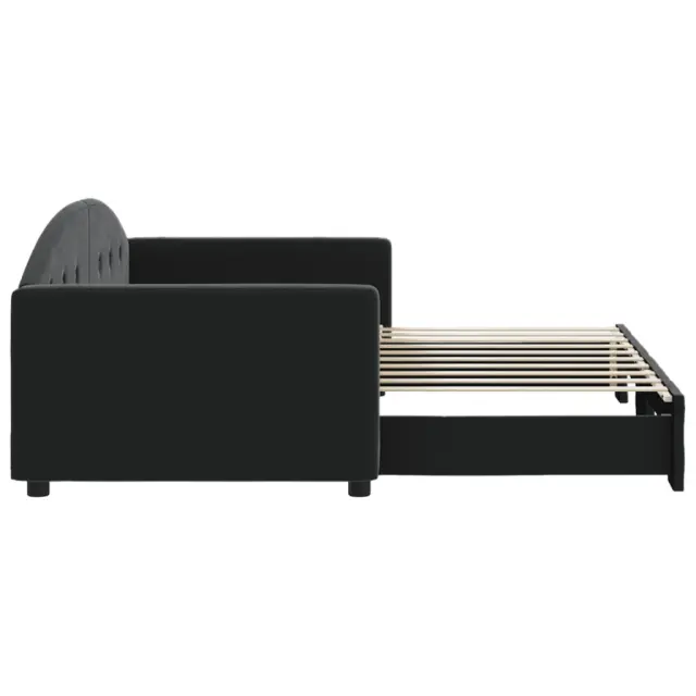 Ta 2 v 1 izvlečna dnevna postelja, ki služi kot kavč in postelja, je praktičen in privlačen dodatek za vašo dnevno sobo ali spalnico. Vsestranska dnevna postelja: Raztegljiva postelja čez dan deluje kot kavč, ponoči pa se z izvlečenim ležiščem zlahka spremeni v zakonsko posteljo, kar je priročna rešitev za sprejemanje gostov in maksimalno povečanje prostora.Mehak žamet in trdna konstrukcija: Ta dnevna postelja ima trpežen okvir iz lesa in kovine ter je oblazinjena z mehkim in udobnim žametom.Sodobno oblikovanje: Kavč postelja ima sodoben dizajn, ki ga odlikujejo čiste linije, minimalističen videz in naravna svetloba, vašim notranjim prostorom pa bo dodal sodoben stil! Dobro je vedeti:Vzmetnice niso priložene tej postelji. Ponujamo različno izbiro ležišč. V naši trgovini si lahko ogledate ustrezne vzmetnice.Barva: ČrnaMaterial: Žamet (100% poliester), kovina, trden lesMaterial letvic: Vezan lesMaterial polnila: Pena Dimenzije (neraztegnjena): 212 x 100 x 75 cm (D x Š x V)Dimenzije (raztegnjena): 212 x 192,5 x 75 cm (D x Š x V)Višina naslonjala za roke, merjena od tal: 58 cmVišina nog: 5 cmVelikost primerne vzmetnice: 90 x 190 cm (Š x D)Potrebno: 2 x vzmetnica (ni vključena)Potrebno sestavljanje: Da 3197316