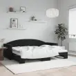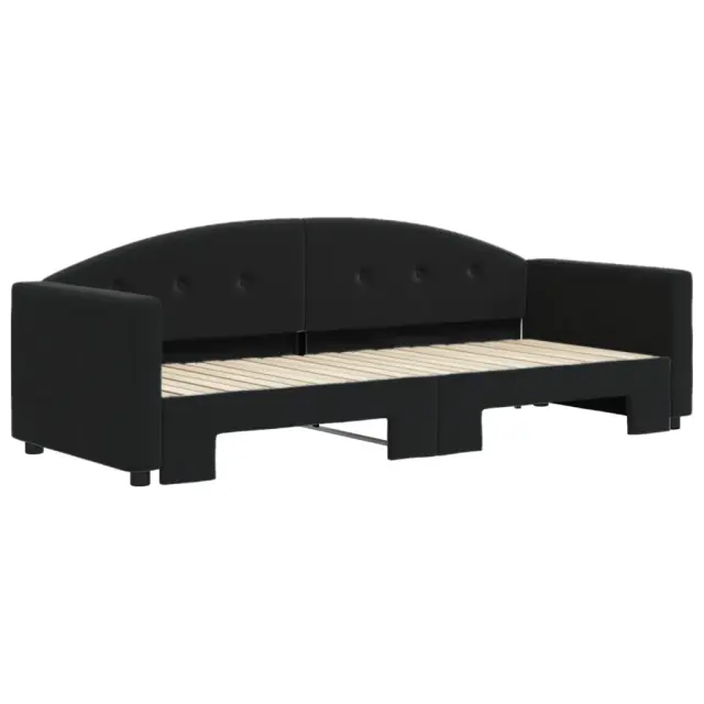 Ta 2 v 1 izvlečna dnevna postelja, ki služi kot kavč in postelja, je praktičen in privlačen dodatek za vašo dnevno sobo ali spalnico. Vsestranska dnevna postelja: Raztegljiva postelja čez dan deluje kot kavč, ponoči pa se z izvlečenim ležiščem zlahka spremeni v zakonsko posteljo, kar je priročna rešitev za sprejemanje gostov in maksimalno povečanje prostora.Mehak žamet in trdna konstrukcija: Ta dnevna postelja ima trpežen okvir iz lesa in kovine ter je oblazinjena z mehkim in udobnim žametom.Sodobno oblikovanje: Kavč postelja ima sodoben dizajn, ki ga odlikujejo čiste linije, minimalističen videz in naravna svetloba, vašim notranjim prostorom pa bo dodal sodoben stil! Dobro je vedeti:Vzmetnice niso priložene tej postelji. Ponujamo različno izbiro ležišč. V naši trgovini si lahko ogledate ustrezne vzmetnice.Barva: ČrnaMaterial: Žamet (100% poliester), kovina, trden lesMaterial letvic: Vezan lesMaterial polnila: Pena Dimenzije (neraztegnjena): 222 x 90 x 75 cm (D x Š x V)Dimenzije (raztegnjena): 222 x 172,5 x 75 cm (D x Š x V)Višina naslonjala za roke, merjena od tal: 58 cmVišina nog: 5 cmPrimerna velikost vzmetnice: 80 x 200 cm (Š x D)Potrebno: 2 x vzmetnica (ni vključena)Potrebno sestavljanje: Da 3197298