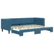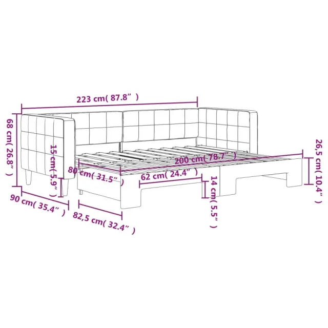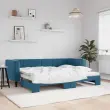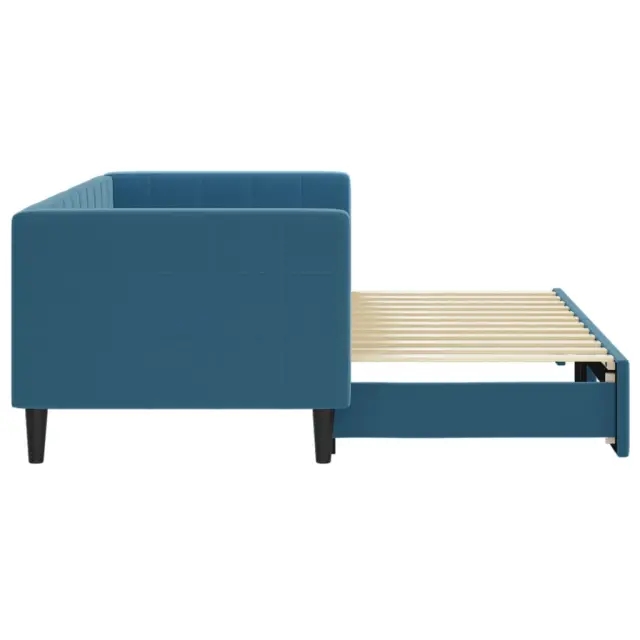 Ta 2 v 1 izvlečna dnevna postelja, ki služi kot kavč in postelja, je praktičen in privlačen dodatek za vašo dnevno sobo ali spalnico. Vsestranska dnevna postelja: Raztegljiva postelja čez dan deluje kot kavč, ponoči pa se z izvlečenim ležiščem zlahka spremeni v zakonsko posteljo, kar je priročna rešitev za sprejemanje gostov in maksimalno povečanje prostora.Mehak žamet in trdna konstrukcija: Ta dnevna postelja ima trpežen okvir iz lesa in kovine ter je oblazinjena z mehkim in udobnim žametom.Sodobno oblikovanje: Kavč postelja ima sodoben dizajn, ki ga odlikujejo čiste linije, minimalističen videz in naravna svetloba, vašim notranjim prostorom pa bo dodal sodoben stil! Dobro je vedeti:Vzmetnice niso priložene tej postelji. Ponujamo različno izbiro ležišč. V naši trgovini si lahko ogledate ustrezne vzmetnice.Barva: ModraMaterial: Žamet (100% poliester), kovina, trden lesMaterial letvic: Vezan lesMaterial polnila: PenaDimenzije (neraztegnjena): 223 x 90 x 68 cm (D x Š x V)Dimenzije (raztegnjena): 223 x 172,5 x 68 cm (D x Š x V)Višina naslonjal za roke, od tal: 68 cmVišina nog: 15 cmPrimerna velikost vzmetnice: 80 x 200 cm (Š x G)Potrebno: 2 x vzmetnica (ni vključena)Potrebno sestavljanje: Da 3196683