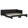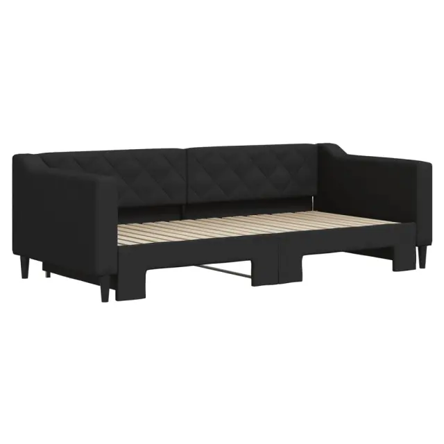 Ta 2 v 1 izvlečna dnevna postelja, ki služi kot kavč in postelja, je praktičen in privlačen dodatek za vašo dnevno sobo ali spalnico. Vsestranska dnevna postelja: Raztegljiva postelja čez dan deluje kot kavč, ponoči pa se z izvlečenim ležiščem zlahka spremeni v zakonsko posteljo, kar je priročna rešitev za sprejemanje gostov in maksimalno povečanje prostora.Vzdržljiva tkanina in trdna konstrukcija: Ta dnevni kavč ima trpežen okvir iz lesa in kovine ter je oblazinjen s trpežno in udobno tkanino.Sodobno oblikovanje: Kavč postelja ima sodoben dizajn, ki jo odlikujejo čiste linije, minimalističen videz, vašim notranjim prostorom pa bo dodala sodoben stil! Dobro je vedeti:Vzmetnice niso priložene tej postelji. Ponujamo različno izbiro ležišč. V naši trgovini si lahko ogledate ustrezne vzmetnice.Barva: ČrnaMaterial: Tkanina (100 % poliester), kovina, trden lesMaterial letvic: Vezan les Material polnila: PenaDimenzije (neraztegnjena): 213 x 100 x 67 cm (D x Š x V)Dimenzije (raztegnjena): 213 x 192,5 x 67 cm (D x Š x V)Višina sedeža, merjena od tal: 26,5 cmVišina nog: 15 cmVelikost primerne vzmetnice: 90 x 190 cm (Š x D) Potrebno: 2 x vzmetnica (ni vključena)Potrebno sestavljanje: Da 3197438