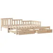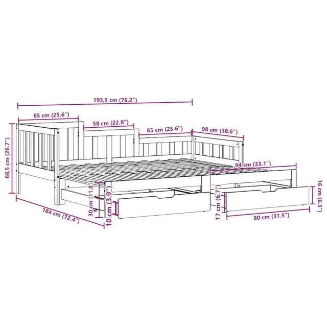 Ta 2 v 1 izvlečna dnevna postelja, ki služi kot kavč in postelja, je praktičen in privlačen dodatek za vašo dnevno sobo ali spalnico. Vsestranska dnevna postelja: Raztegljiva postelja čez dan deluje kot kavč, ponoči pa se z izvlečenim ležiščem zlahka spremeni v zakonsko posteljo, kar je priročna rešitev za sprejemanje gostov in maksimalno povečanje prostora.Stabilen in dolgotrajen okvir: Trdna borovina je znana po svoji trdnosti in trajnosti. Ravni vzorci in značilni vozli prispevajo k njenemu rustikalnemu čaru.Letvice za optimalno podporo: Postelja je opremljena z letvicami, ki zagotavljajo osnovno podporo in zračnost vašega ležišča.Veliko prostora za shranjevanje: Ta postelja za goste ima dva predala, ki zagotavljata dovolj prostora za shranjevanje oblačil, nogavic, igrač, blazin itd. Dobro je vedeti:Vzmetnice niso priložene tej postelji. Ponujamo različno izbiro ležišč. V naši trgovini si lahko ogledate ustrezne vzmetnice.Material: Trdna borovina (neobdelana) Dimenzije (raztegnjena): 193,5 x 184 x 68,5 cm (D x Š x V) Dimenzije (neraztegnjena): 193,5 x 98 x 68,5 cm (D x Š x V) Velikost primerne vzmetnice: 90 x 190 cm (Š x D) Potrebno: 2 x vzmetnica (ni vključena)Višina prostora pod posteljo: 21 cmDimenzije predalov za posteljo (vsak): 80 x 55 x 17 cm (Š x G x V)Potrebno sestavljanje: DaPaket vsebuje:1 x Izvlečna dnevna postelja2 x Posteljni predal 3302223
