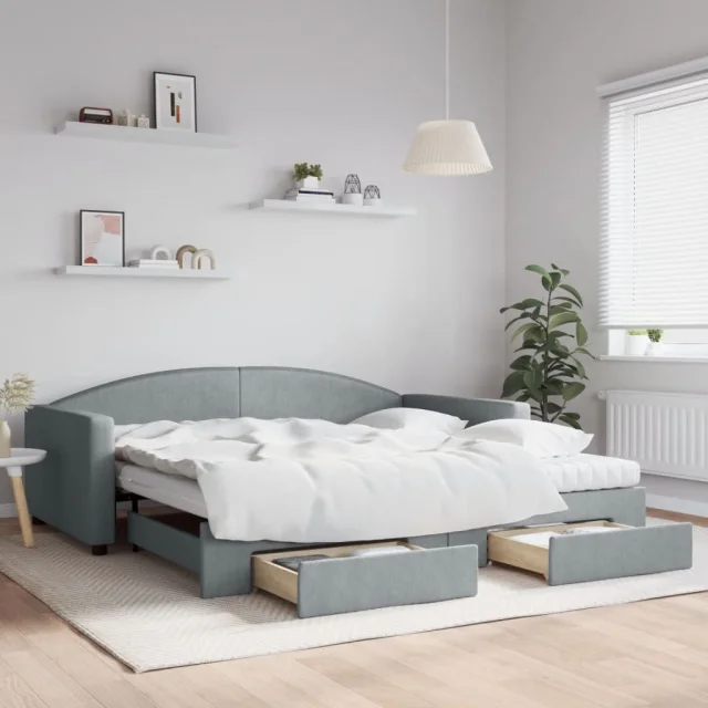 vidaXL Izvlečna dnevna postelja s predali svetlo siva 100x200 cm blago