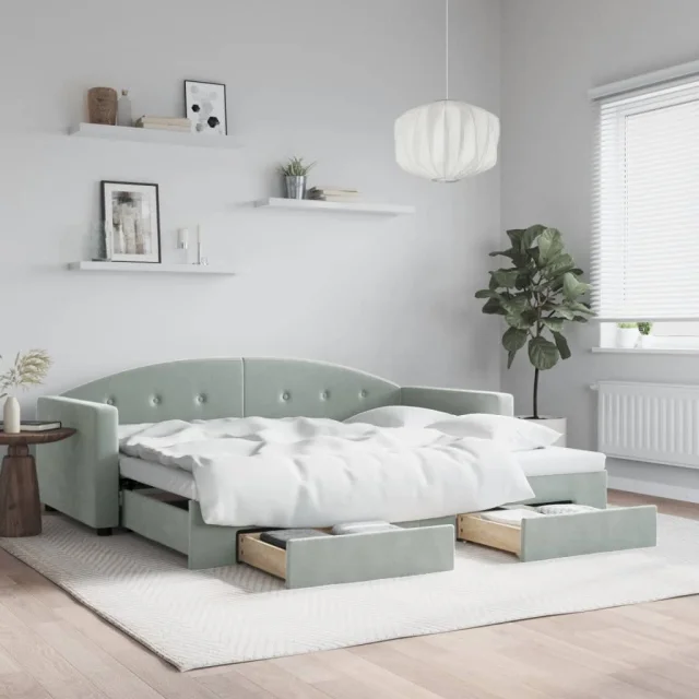 Ta 2 v 1 izvlečna dnevna postelja s predali, ki služi kot kavč in postelja, je praktičen in privlačen dodatek za vašo dnevno sobo ali spalnico.