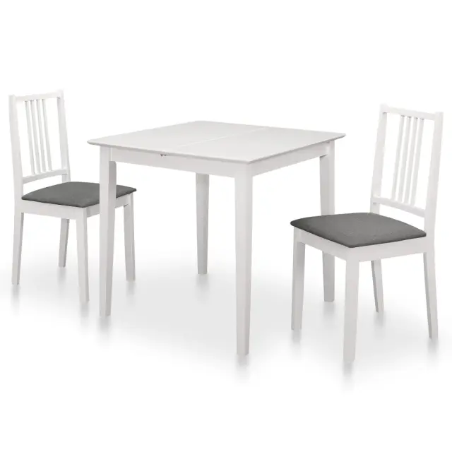 Ta 3-delna jedilna garnitura z brezčasnim in trpežnim dizajnom bo v vaše notranje prostore vnesla pridih stila. Raztegljiva jedilna miza in stoli so izdelani iz trdnega kavčukovca, zato so zelo stabilni in trpežni. Zahvaljujoč edinstveni obliki lahko mizo raztegnete, ko boste potrebovali dodaten prostor. Naslonjala in blazine stolov prispevajo k udobnemu sedenju. Ta jedilna garnitura je preprosta za čiščenje z vlažno krpo. Jedilna garnitura je preprosta za sestavo. Paket vsebuje 1 raztegljivo mizo in 2 stola.Jedilna miza:Barva: BelaDimenzije: (80-120) x 80 x 74 cm (D x Š x V)Material: Trden les kavčukovca + površina mize iz mediapanaMiza se lahko raztegne od 80 do 120 cmJedilni stoli:Barva: Bela in sivaMaterial stola: Trden kavčukovecMaterial blazine: 100 % poliesterDimenzije: 40 x 49 x 88,5 cm (Š x G x V)Širina sedeža: 40 cmGlobina sedeža: 40 cmVišina sedišča, merjena od tal: 44 cmPaket vsebuje 1 jedilno mizo in 2 jedilna stola z blazinami 276395