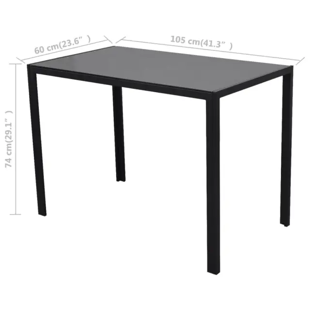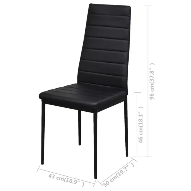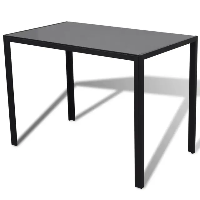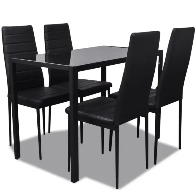 Jedilni komplet vsebuje 1 mizo in 4 stole iz umetnega usnja. Ponaša se z elegantno in moderno obliko, zato je idealen za tiste, ki bi radi v svoje notranje prostore vnesli pridih stila. Površina mize je narejena iz izjemno močnega kaljenega stekla, ki omogoča enostavno čiščenje. Vsak stol je oblečen v visokokakovostno umetno usnje. Mehki, podloženi sedeži so zelo udobni. Paket vsebuje 1 mizo in 4 stole.Barva: ČrnaMaterial mize: Kaljeno steklo + jeklen okvirMaterial stolov: Umetno usnje + lesen okvir + jeklene nogeDimenzije mize: 105 x 60 x 74 cm (D x Š x V)Dimenzije stola: 43 x 50 x 96 cm (Š x G x V)Velikost sedeža: 43 x 39 cm (Š x G)Višina sedeža, merjena od tal: 46 cmPaket vsebuje 1 mizo in 4 stoleTkanina: Bombaž: 5%, PVC: 95% 275412