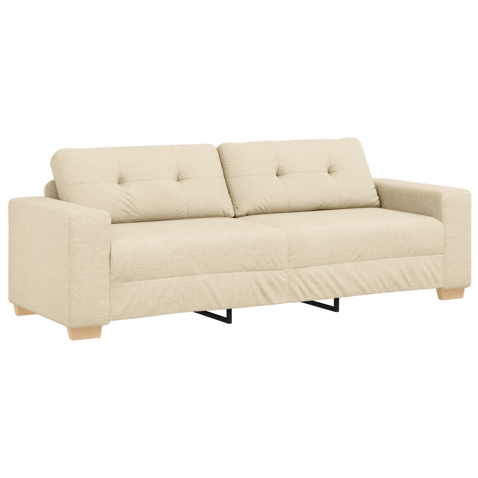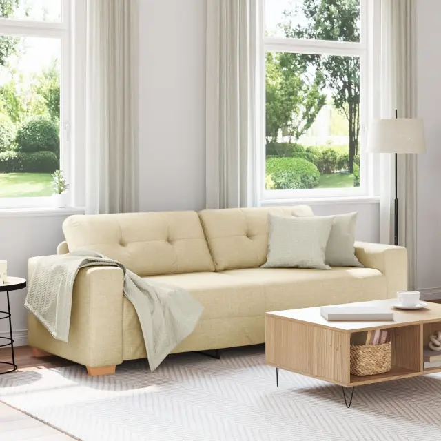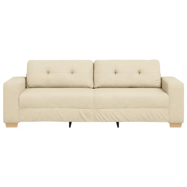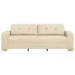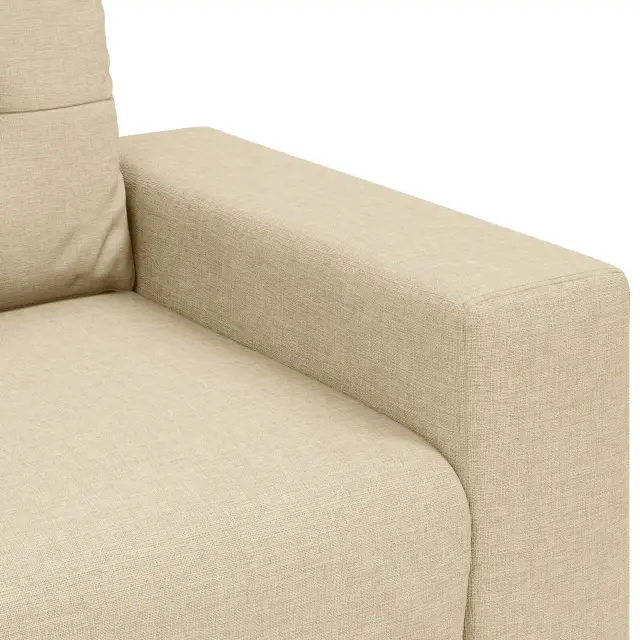 Ta kremna oblazinjena sedežna garnitura je čudovit dodatek k vsaki dnevni sobi, zasnovana za udobje in stil. Ima dovolj prostora za tri, njen eleganten pravokoten dizajn pa ustvari super vzdušje za sprostitev ali zabavo prijateljev.