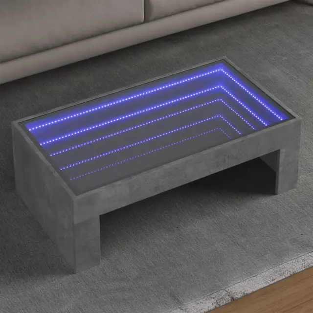 Edinstvena klubska mizica z neskončnim LED ogledalom je primerna za različne prostore. Stabilen in trpežen material: Inženirski les je trpežen in stabilen material z gladko površino, ki je odporen na vlago, krivljenje in cepljenje, zato je zanesljiva izbira za različne projekte.RGB LED lučke za prijeten ambient: Ta mizica je opremljena z LED lučkami, ki jih je mogoče preprosto prilagoditi in tako ustvariti prilagojeno svetlobno predstavo. Prilagodite lahko načine, barve in svetlost ter tako izboljšate vzdušje v notranjem prostoru.Močna površina: Močna površina mize za dnevno sobo je idealna za odlaganje pijače, hrane in drugih okrasnih predmetov.Večnamenska uporaba: Ta klubska mizica je primerna za več namenov. V dnevni sobi ali spalnici lahko služi kot stranska mizica, odstavna mizica ali mizica za ob kavč ter ustreza vašim posebnim potrebam. Dobro je vedeti:Izdelek ima priključek USB, ki zahteva certificiran vir napajanja 5 V USB (ni priložen).Barva: Betonsko sivaMaterial: Inženirski les, stekloDimenzije: 90 x 50 x 30 cm (D x Š x V)Največja nosilnost (skupaj): 30 kgNajvečja nosilnost (zgornji del ogledala): 5 kgNajvečja nosilnost (laminat): 20 kgZ LED lučkamiPotrebno sestavljanje: Da 847619