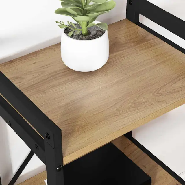 • Črno jekleno ogrodje: Ogrodje je izdelano iz trdnega jekla v elegantni črni barvi, kar zagotavlja moč in privlačen videz. Njegova robustna konstrukcija podpira težo številnih predmetov in nudi stabilno ter varno postavitev.