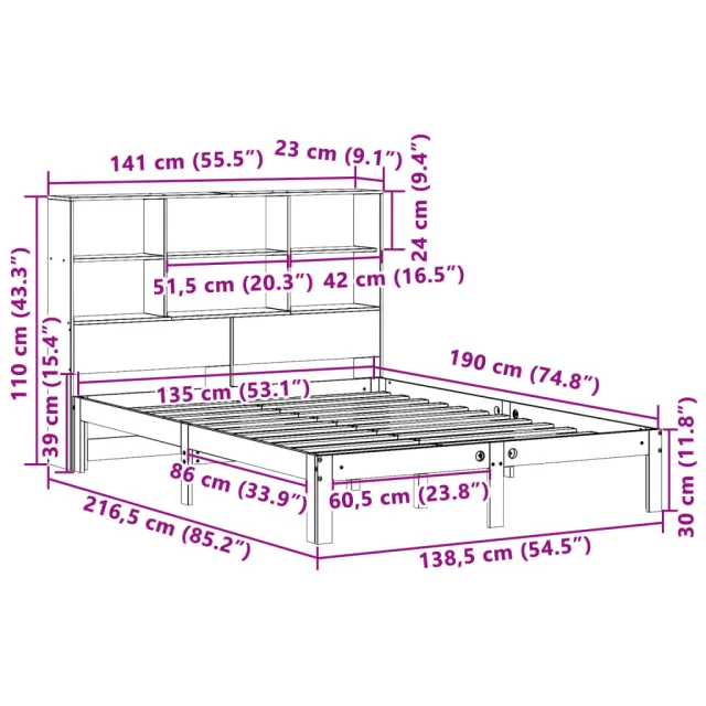 vidaXL Knjižna postelja brez vzmetnice vošč. rjava 135x190 cm borovina