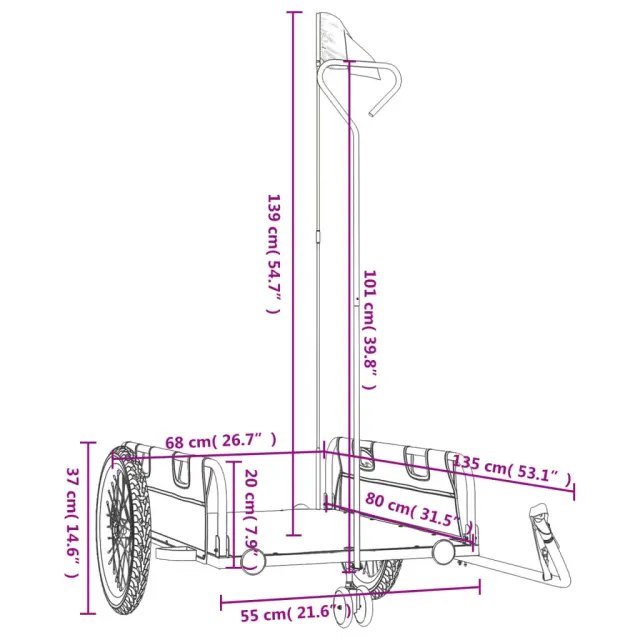 • Trden material: Železo je močan in trd material. Je zelo priljubljeno v industrijskih in pohištvenih konstrukcijah. Ta kolesarska tovorna prikolica je izdelana iz železa, zato je zelo trpežna in vzdržljiva.