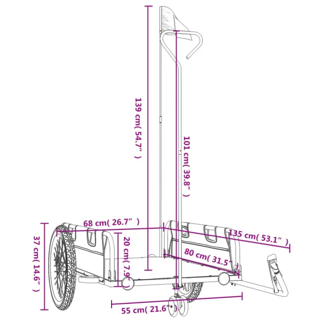 • Trden material: Železo je močan in trd material. Je zelo priljubljeno v industrijskih in pohištvenih konstrukcijah. Ta kolesarska tovorna prikolica je izdelana iz železa, zato je zelo trpežna in vzdržljiva.