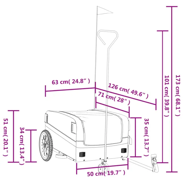 • Trden material: Železo je močan in trd material. Je zelo priljubljeno v industrijskih in pohištvenih konstrukcijah. Ta kolesarska tovorna prikolica je izdelana iz železa, zato je zelo trpežna in vzdržljiva.
