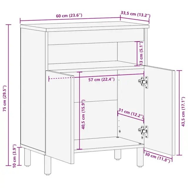 Ta klasična komoda bo dekorativen in praktičen dodatek za vaš dom. Robusten in stabilen material: Zaradi svoje izjemne trpežnosti in trdnosti je robusten mangov les, trden tropski les, zelo priljubljen za izdelavo pohištva. Zaradi čudovitih vzorcev lesa se vsak kos pohištva nekoliko razlikuje od ostalih.Veliko prostora za shranjevanje: Ta omarica ponuja veliko prostora za shranjevanje revij, knjig, DVDjev, daljinskih upravljalnikov in drugih majhnih predmetov, da bodo dobro organizirani in na dosegu roke.Stabilna in trpežna mizna plošča: Trdna mizna plošča je idealna za odlaganje pijače ali drugih potrebščin, ki jih potrebujete pri roki.Stabilen in dolgotrajen okvir: Železen okvir komode izboljša vašo notranjost z industrijskim slogom ter zagotavlja izjemno vzdržljivost, stabilnost in odpornost proti koroziji. Dobro je vedeti:Vsak izdelek je edinstven, saj se med seboj razlikujejo po barvah in zrnatosti. Dostava je naključna, kar zagotavlja ekskluzivnost in individualnost vašega izdelka. Opozorilo:Za preprečitev prevračanja je treba ta izdelek uporabiti s priloženo napravo za pritrditev na steno.Barva: ČrnaMaterial: Trden robusten mangov les, železoDimenzije: 60 x 33,5 x 75 cm (D x Š x V)Višina nog: 10 cmZ 2 vratiPotrebno sestavljanje: DaLegal Documents:Več informacij o tem, kako preprečiti prevračanje pohištva, je na voljo tukaj 4018653