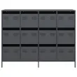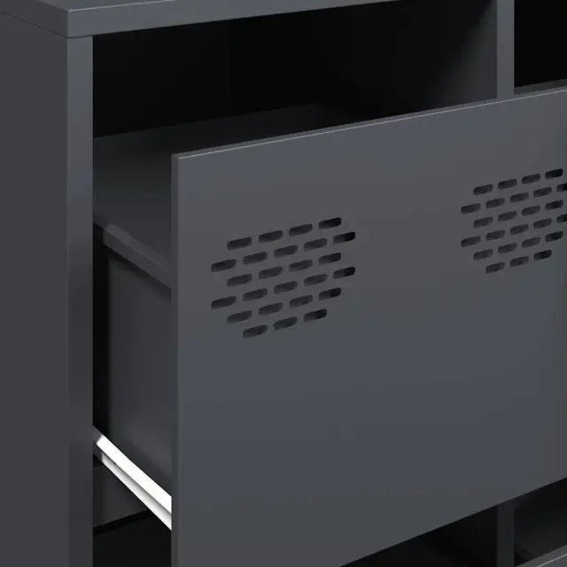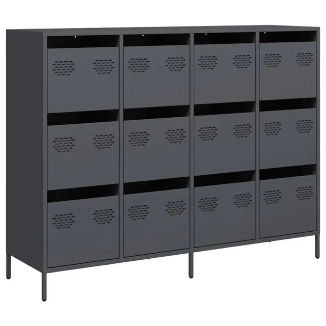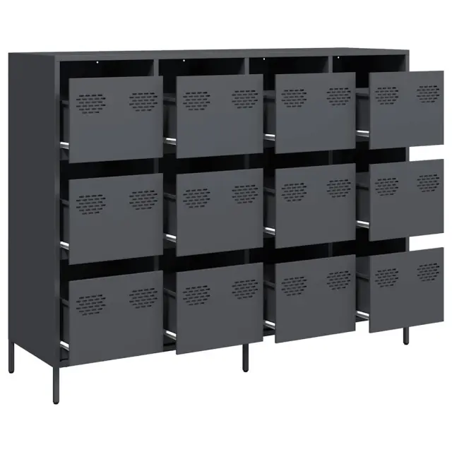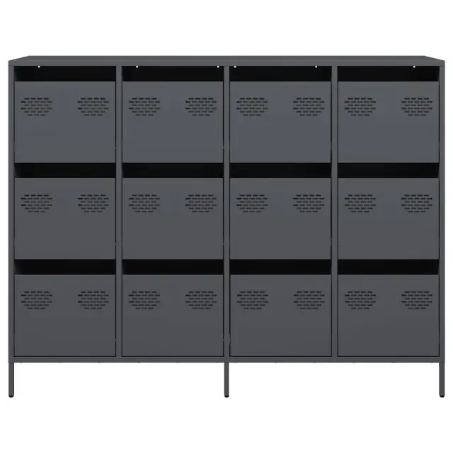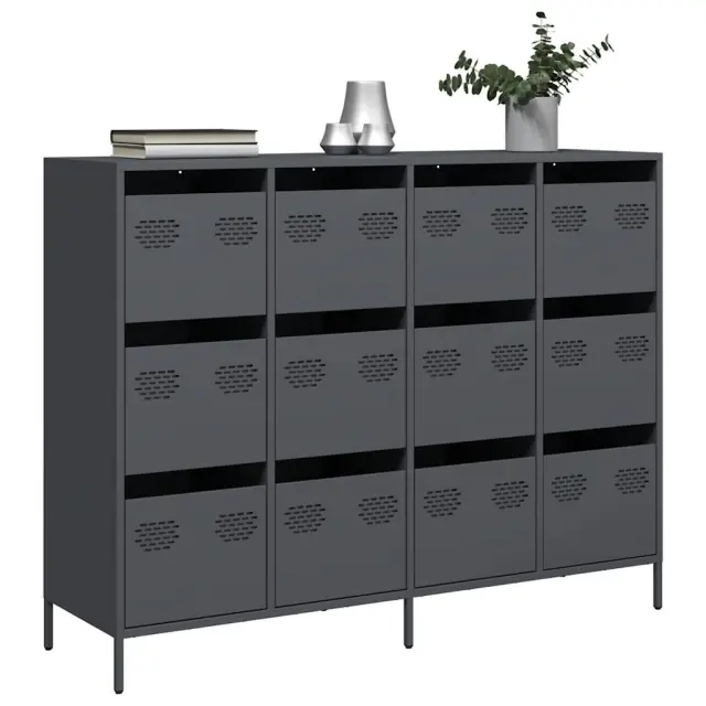 Ta praktična komoda je resnično privlačen dodatek za vaš dom. Robustno in stabilno: Hladno valjano jeklo je vrsta nizkoogljičnega jekla, ki se proizvaja s postopkom hladnega valjanja in obdeluje pri skoraj običajnih sobnih temperaturah. Hladno valjano jeklo ima bolj gladko površino, večjo trdnost in natančnost.Veliko prostora za shranjevanje: V omarici s predali je dovolj prostora za shranjevanje, da bodo različne vsakodnevne potrebščine dobro urejene in dosegljive.Robustna mizna plošča: Na njej lahko postavite okrasne predmete, albume s fotografijami ali manjše rastline.Enostavno vzdrževanje: Zaradi gladke površine je kovinsko kredenco enostavno očistiti z vlažno krpo in zahteva manj vzdrževanja. Opozorilo:Za preprečitev prevračanja je treba ta izdelek uporabiti s priloženo napravo za pritrditev na steno.Barva: AntracitnaMaterial: Hladno valjano jekloDimenzije: 135 x 39 x 103,5 cm (D x Š x V)Z 12 predaliPotrebno sestavljanje: Da 3307175