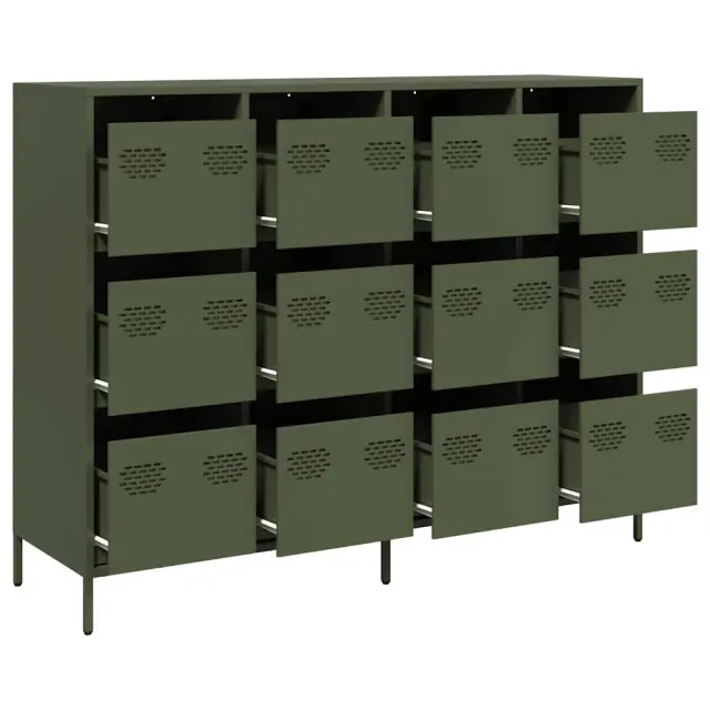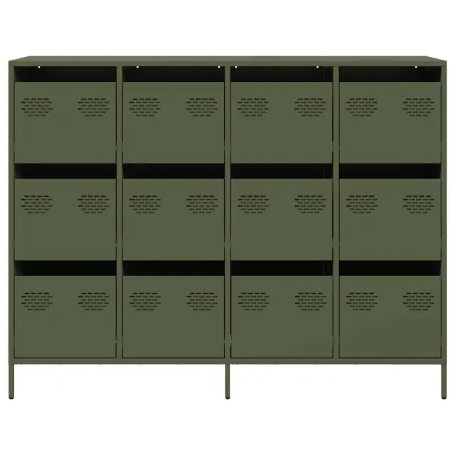 Ta praktična komoda je resnično privlačen dodatek za vaš dom. Robustno in stabilno: Hladno valjano jeklo je vrsta nizkoogljičnega jekla, ki se proizvaja s postopkom hladnega valjanja in obdeluje pri skoraj običajnih sobnih temperaturah. Hladno valjano jeklo ima bolj gladko površino, večjo trdnost in natančnost.Veliko prostora za shranjevanje: V omarici s predali je dovolj prostora za shranjevanje, da bodo različne vsakodnevne potrebščine dobro urejene in dosegljive.Robustna mizna plošča: Na njej lahko postavite okrasne predmete, albume s fotografijami ali manjše rastline.Enostavno vzdrževanje: Zaradi gladke površine je kovinsko kredenco enostavno očistiti z vlažno krpo in zahteva manj vzdrževanja. Opozorilo:Za preprečitev prevračanja je treba ta izdelek uporabiti s priloženo napravo za pritrditev na steno.Barva: Olivno zelenaMaterial: Hladno valjano jekloDimenzije: 135 x 39 x 103,5 cm (D x Š x V)Z 12 predaliPotrebno sestavljanje: Da 3307177