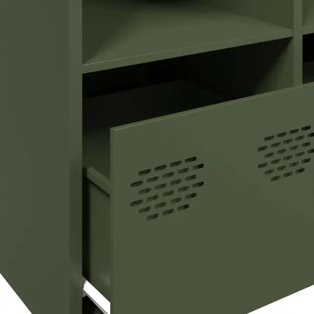 Ta praktična komoda je resnično privlačen dodatek za vaš dom. Robustno in stabilno: Hladno valjano jeklo je vrsta nizkoogljičnega jekla, ki se proizvaja s postopkom hladnega valjanja in obdeluje pri skoraj običajnih sobnih temperaturah. Hladno valjano jeklo ima bolj gladko površino, večjo trdnost in natančnost.Veliko prostora za shranjevanje: V omarici s predali je dovolj prostora za shranjevanje, da bodo različne vsakodnevne potrebščine dobro urejene in dosegljive.Robustna mizna plošča: Na njej lahko postavite okrasne predmete, albume s fotografijami ali manjše rastline.Enostavno vzdrževanje: Zaradi gladke površine je kovinsko kredenco enostavno očistiti z vlažno krpo in zahteva manj vzdrževanja. Opozorilo:Za preprečitev prevračanja je treba ta izdelek uporabiti s priloženo napravo za pritrditev na steno.Barva: Olivno zelenaMaterial: Hladno valjano jekloDimenzije: 135 x 39 x 73,5 cm (D x Š x V)S 4 predali in 4 predalčkiPotrebno sestavljanje: Da 3307165