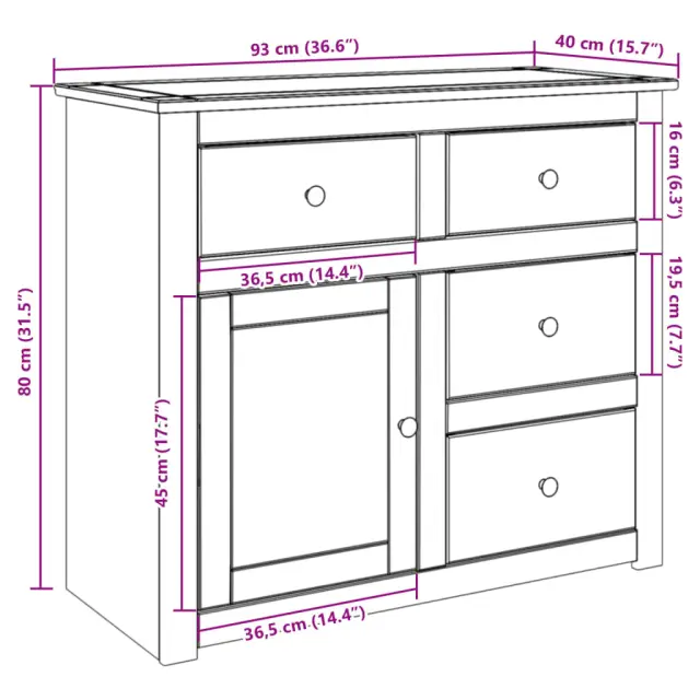 Če vam primanjkuje prostora, a potrebujete več prostora za shranjevanje, vam bo ta lesena komoda zagotovo pomagala! Trdna borovina: Trdna borovina je čudovit naravni material. Borovina ima ravne vzorce, grče pa dajejo materialu njegov značilen, rustikalen videz. Omara za shranjevanje je izdelana iz trdnega borovega lesa, zato je trpežna in stabilna.Prostorno in funkcionalno shranjevanje: V 4 predalih in predelku je v komodi dovolj prostora za urejeno shranjevanje stvari. Poleg tega ima več možnosti uporabe. Komodo lahko uporabljate tudi kot bife, kuhinjsko omarico ali stransko omarico za dnevno sobo ali hodnik.Enostavno vzdrževanje: Leseno omarico je enostavno očistiti z vlažno krpo in zahteva manj vzdrževanja.Praktični gumbi: Stranska omarica je opremljena z gumbi, ki omogočajo enostavno odpiranje in zapiranje, hkrati pa ji dodajajo dodatno lepoto. Opozorilo:Za preprečitev prevračanja je treba ta izdelek uporabiti s priloženo napravo za pritrditev na steno.Material: Trdna borovina s prevleko iz medenega voska, inženirski lesDimenzije: 93 x 40 x 80 cm (Š x G x V)Ime zbirke: PanamaPotrebno sestavljanje: DaLegal Documents:Več informacij o tem, kako preprečiti prevračanje pohištva, je na voljo tukaj 4016384