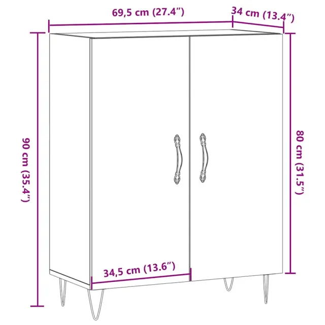 Ta klasična komoda z brezčasnim videzom je odličen dodatek za vaš dom. Vzdržljiv material: Inženirski les se ponaša z izjemno kakovostjo, gladko površino ter močjo, stabilnostjo in odpornostjo na vlago. Ta omarica iz inženirskega lesa je preprosta za čiščenje z vlažno krpo.Veliko prostora za shranjevanje: V stranski omarici je dovolj prostora za shranjevanje, da bodo različne vsakodnevne potrebščine dobro urejene in dosegljive.Razstavna funkcija: Površina komode je odlična za razstavljanje vaših okrasnih predmetov, foto albumov ali majhnih rastlin.Praktični ročaji: Omarica je opremljena z ročaji, ki omogočajo udoben oprijem, omogočajo enostavno odpiranje in zapiranje omarice, hkrati pa ji dajejo dodatno lepoto.Kovinske noge: Kovinske noge dodajo vaši notranjosti umirjen slog, hkrati pa zagotavljajo stabilnost. Opozorilo:Za preprečitev prevračanja je treba ta izdelek uporabiti s priloženo napravo za pritrditev na steno.Barva: Starinski lesMaterial: Inženirski les, kovinaDimenzije: 69,5 x 34 x 90 cm (Š x G x V)Potrebno sestavljanje: Da 857177