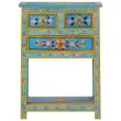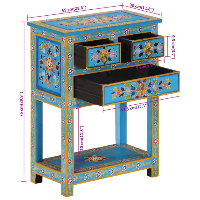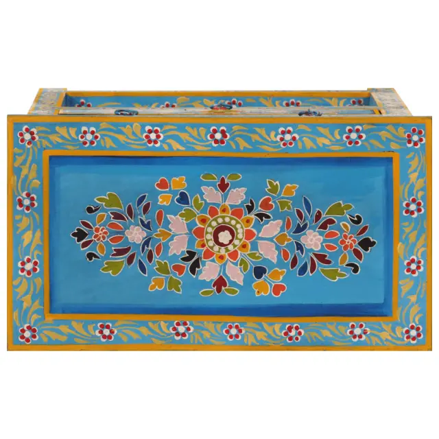 Ta čudovita lesena komoda je ročno izdelana iz trdnega mangovega lesa in okrašena z bogatimi, ročno poslikanimi okraski. S svojim barvitim dizajnom bo privlačen dodatek vašemu domu. Trden mangov les: Trden mangov les je močan in trden tropski les, iz katerega je mogoče izdelati trpežno pohištvo. Zaradi čudovitih vzorcev lesa se vsak kos pohištva nekoliko razlikuje od ostalih. Omarica za shranjevanje iz trdnega mangovega lesa je vzdržljiva in stabilna.Prostoren prostor za shranjevanje: Omarica s 3 predali in 1 polico ponuja dovolj prostora za urejeno shranjevanje stvari. Ročno poslikana zasnova: Pohištvo za shranjevanje ima obsežne ročno poslikane okrasne podrobnosti, ki ustvarjajo topel in bogat učinek.Enostavno vzdrževanje: Leseno omarico je enostavno očistiti z vlažno krpo in zahteva manj vzdrževanja. Opozorilo:Za preprečitev prevračanja je treba ta izdelek uporabiti s priloženo napravo za pritrditev na steno.Barva: Večbarvno (turkizna osnova)Material: Trden mangov les z ročno poslikanim zaključkomDimenzije: 55 x 30 x 76 cm (Š x G x V)Ročno izdelanoPotrebno sestavljanje: DaLegal Documents:Več informacij o tem, kako preprečiti prevračanje pohištva, je na voljo tukaj 355011