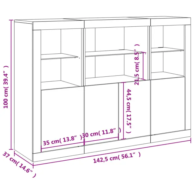 Okrasite svojo sobo s temi sodobnimi komodami z LED lučkami, ki se lepo podajo k pohištvu v katerem koli slogu v vaši hiši. Vzdržljiv material: Inženirski les se ponaša z izjemno kakovostjo, gladko površino ter močjo, stabilnostjo in odpornostjo na vlago.Veliko prostora za shranjevanje: Ti bifeji ponujajo veliko prostora za shranjevanje revij, knjig, daljinskih upravljalnikov in drugih majhnih predmetov, da bodo dobro organizirani in na dosegu roke.Razstavna funkcija: Robustna zgornja površina omaric je idealna za razstavljanje okrasnih predmetov, okvirjev za fotografije ali rastlin v lončkih.Prilagodljive LED lučke: Te omare za shranjevanje so opremljene z RGB LED lučmi, ki imajo različne menije za spreminjanje barve svetlobe in samodejno prilagajanje, kar vaš dom okrasi barvito in lepo. Opozorilo:Za preprečitev prevračanja je treba ta izdelek uporabiti s priloženo napravo za pritrditev na steno.Dobro je vedeti:Izdelek ima priključek USB, ki zahteva certificiran vir napajanja 5 V USB (ni priložen).Barva: Dimljeni hrastMaterial: Inženirski les, stekloCelotne dimenzije: 142,5 x 37 x 100 cm (Š x G x V)Potrebno sestavljanje: DaPaket vsebuje:2 x Komoda: 41 x 37 x 100 cm (Š x G x V)1 x Komoda: 60,5 x 37 x 100 cm (Š x G x V)Legal Documents:Več informacij o tem, kako preprečiti prevračanje pohištva, je na voljo tukaj 3209111