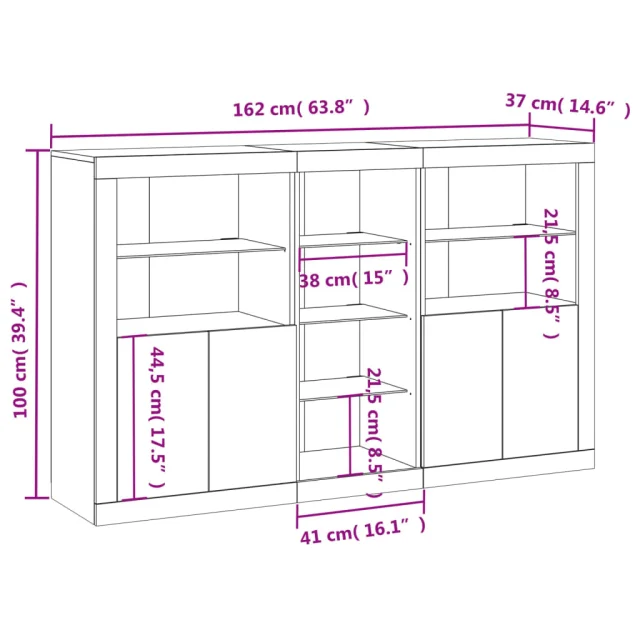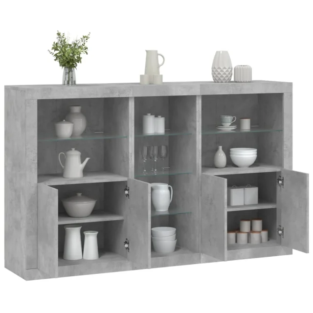 • RGB LED luči: Bife omarica je opremljena z živahnimi RGB LED lučkami. Z različnimi prilagodljivimi meniji lahko brez težav spreminjate barvo luči in celo nastavite njihovo samodejno prilagajanje. Te LED lučke ne le poudarjajo sodoben videz komode, temveč tudi povečujejo njeno modno privlačnost.