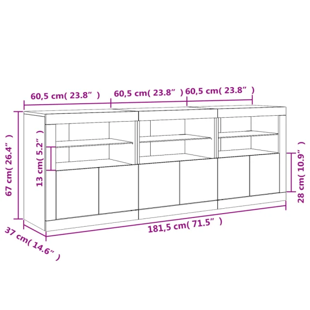 • RGB LED luči: Bife omarica je opremljena z živahnimi RGB LED lučkami. Z različnimi prilagodljivimi meniji lahko brez težav spreminjate barvo luči in celo nastavite njihovo samodejno prilagajanje. Te LED lučke ne le poudarjajo sodoben videz komode, temveč tudi povečujejo njeno modno privlačnost.