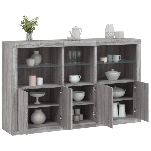 • RGB LED luči: Bife omarica je opremljena z živahnimi RGB LED lučkami. Z različnimi prilagodljivimi meniji lahko brez težav spreminjate barvo luči in celo nastavite njihovo samodejno prilagajanje. Te LED lučke ne le poudarjajo sodoben videz komode, temveč tudi povečujejo njeno modno privlačnost.