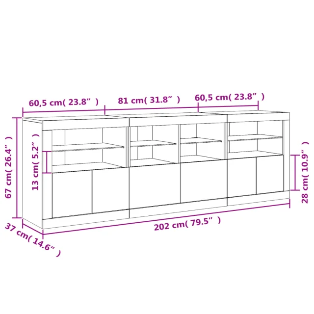 • RGB LED luči: Bife omarica je opremljena z živahnimi RGB LED lučkami. Z različnimi prilagodljivimi meniji lahko brez težav spreminjate barvo luči in celo nastavite njihovo samodejno prilagajanje. Te LED lučke ne le poudarjajo sodoben videz komode, temveč tudi povečujejo njeno modno privlačnost.