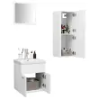 S tem stilskim kompletom kopalniškega pohištva z osupljivim in urejenim izgledom lahko ustvarite dodaten prostor za shranjevanje v kopalnici. Čiste linije in eleganten dizajn zagotavljajo, da se bo popolnoma podal v vašo kopalnico. Ta komplet pohištva vsebuje omarico za umivalnik, nizko omarico in ogledalo. Elegantna omarica za umivalnik ima 1 predelek, površina pa je idealna za namestitev umivalnika. Nizka omarica ima 2 predelka z dovolj prostora za shranjevanje stvari v vaši kopalnici. Ogledalo prispeva k odličnemu izgledu vašega dekorja. Ta kopalniška garnitura je preprosta za čiščenje z vlažno krpo. Prosimo, upoštevajte: umivalnik, pipa in odtok niso priloženi.Barva: BelaMaterial: Iverna plošča, akrilDimenzije ogledala: 40 x 1,5 x 37 cm (Š x G x V)Dimenzije omarice za umivalnik: 41 x 38,5 x 46 cm (Š x G x V)Dimenzije nizke omarice: 30 x 30 x 80 cm (Š x G x V)Potrebno sestavljanje: DaPaket vsebuje:1 x Ogledalo1 x Omarica za umivalnik1 x Nizka omarica 3070991