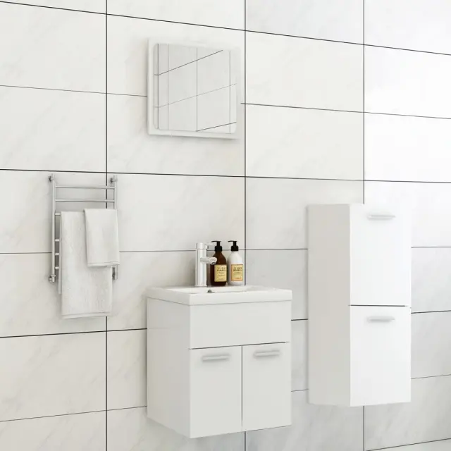 S tem stilskim kompletom kopalniškega pohištva z osupljivim in urejenim izgledom lahko ustvarite dodaten prostor za shranjevanje v kopalnici. Čiste linije in eleganten dizajn zagotavljajo, da se bo popolnoma podal v vašo kopalnico. Komplet pohištva je sestavljen iz omarice za umivalnik, nizke omarice, vgradnega umivalnika in ogledala. Elegantna omarica za umivalnik ima 1 predelek, površina pa je idealna za namestitev umivalnika. Nizka omarica ima 2 predelka, zato ponuja veliko prostora za shranjevanje stvari v vaši kopalnici. Keramičen umivalnik je več kot samo umivalnik, saj je tudi okras za vaš bivalni prostor. Zahvaljujoč modernemu in sodobnemu dizajnu se bo umivalnik zagotovo podal k vsakemu dekorju. Ima tudi odprtino za prelivanje, če se preveč napolni. Ogledalo bo dekorju v vašem domu dodalo odličen izgled. Kopalniška garnitura je preprosta za čiščenje z vlažno krpo. Prosimo, upoštevajte: Priložena sta armatura in potisni odtok s funkcijo za prelivanje.Barva: BelaMaterial: Iverna plošča, akrilDimenzije ogledala: 40 x 1,5 x 37 cm (Š x G x V)Dimenzije omarice za umivalnik: 41 x 38,5 x 46 cm (Š x G x V)Dimenzije nizke omarice: 30 x 30 x 80 cm (Š x G x V)Dimenzije vgradnega umivalnika: 42 x 39 x 18 cm (D x Š x V)Debelina keramičnega roba: 4 cmPremer odprtine za odtok: 4,5 cmZ odprtino proti prelivanjuS pipoPotisni odtok s funkcijo prelivanjaPotrebno sestavljanje: DaPaket vsebuje:1 x Ogledalo1 x Omarica za umivalnik1 x Nizka omarica1 x Vgradni umivalnik z armaturo 3071441