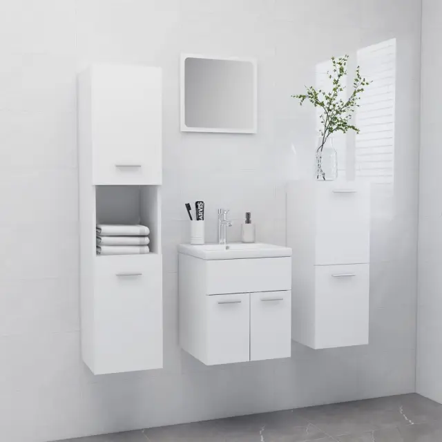 S tem stilskim kompletom kopalniškega pohištva z osupljivim in urejenim izgledom lahko ustvarite dodaten prostor za shranjevanje v kopalnici. Čiste linije in eleganten dizajn zagotavljajo, da se bo popolnoma podal v vašo kopalnico. Ta komplet pohištva je sestavljen iz omarice za umivalnik z umivalnikom, nizke omarice, visoke omarice in ogledala. Elegantna omarica za umivalnik z 1 predelkom se popolnoma poda pod umivalnik ter omogoča priročno shranjevanje v kopalnici. Keramičen umivalnik je več kot samo vsakodnevni pripomoček, saj je tudi okras za vaš bivalni prostor. Zahvaljujoč modnemu in sodobnemu dizajnu se bo umivalnik podal k vsakemu dekorju. Ima tudi luknjo za odtekanje vode, če se umivalnik preveč napolni. Visoka omarica ima skupno 5 predelkov in 2 vrata, nizka omarica pa ima 2 predelka. Ti 2 omarici ponujata veliko možnosti za shranjevanje ter dodaten prostor za stvari v vaši kopalnici. Ogledalo se lepo poda k dekorju. Ta komplet kopalniškega pohištva je preprost za čiščenje z vlažno krpo. Prosimo, upoštevajte: pipa in odtok nista priložena.Barva: BelaMaterial: Iverna plošča, akril, keramikaDimenzije ogledala: 40 x 1,5 x 37 cm (Š x G x V)Dimenzije omarice za umivalnik: 41 x 38,5 x 46 cm (Š x G x V)Dimenzije nizke omarice: 30 x 30 x 80 cm (Š x G x V)Dimenzije visoke omare: 30 x 30 x 130 cm (Š x G x V)Dimenzije vgradnega umivalnika: 42 x 39 x 18 cm (D x Š x V)Debelina keramičnega roba: 4 cmPremer odprtine za odtok: 4,5 cmZ odprtino proti prelivanjuPotrebno sestavljanje: DaPaket vsebuje:1 x Ogledalo1 x Omarica za umivalnik1 x Nizka omarica1 x Visoka omara1 x Vgradni umivalnik 3071081