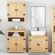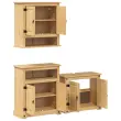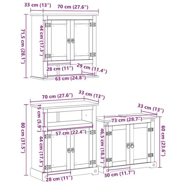 Ta leseni komplet kopalniškega pohištva je odličen dodatek vaši kopalnici, saj ji daje urejen in osupljiv videz! Robusten in stabilen okvir: Trdna borovina je znana po svoji trdnosti in trajnosti. Ravni vzorci in značilni vozli prispevajo k njenemu rustikalnemu čaru.Veliko prostora za shranjevanje: To kopalniško pohištvo ponuja veliko prostora za shranjevanje, v katerega zlahka spravite nujne toaletne potrebščine in kopalniške pripomočke, kot so mila, šampon, zobna pasta itd.Praktični ročaji: Omarica je opremljena z ročaji, ki omogočajo udoben oprijem, omogočajo enostavno odpiranje in zapiranje omarice, hkrati pa ji dajejo dodatno lepoto.Praktična vrata: Skrbite, da v prostoru ne bo nereda, tako da za vrati te kopalniške omarice skrijete manjše potrebščine.Enostavno vzdrževanje: Zaradi gladke površine je kopalniško omaro enostavno očistiti z vlažno krpo, saj ne potrebuje veliko vzdrževanja. Dobro je vedeti:Vijaki in čepi za notranjost stene niso priloženi. Svetujemo vam, da poiščete in uporabite vijake in zatiče za namestitev, ki so primerni za vaše stene. Če niste prepričani, se lahko posvetujete s strokovnjakom. Preberite in upoštevajte vse korake v navodilih. Opozorilo:Za preprečitev prevračanja je treba ta izdelek uporabiti s priloženo napravo za pritrditev na steno.Omarica za umivalnik:Material: Trdna borovina s premazom iz medenega voska, inženirski les, kovinaDimenzije: 73 x 33 x 60 cm (Š x G x V)Velikost vrat: 30 x 46,5 cm (Š x V)Kopalniška omarica:Material: Trdna borovina s premazom iz medenega voska, inženirski les, kovinaDimenzije: 70 x 33 x 80 cm (Š x G x V)Velikost vrat: 28 x 44 cm (Š x V)Velikost police: 57 x 15 cm (Š x V)Stenska omarica:Material: Trdna borovina s premazom iz medenega voska, inženirski les, kovinaDimenzije: 70 x 33 x 71,5 cm (Š x G x V)Velikost vrat: 28 x 44 cm (Š x V)Ime zbirke: CoronaPotrebno sestavljanje: DaPaket vsebuje:1 x Stenska omarica1 x Omarica za umivalnik1 x Kopalniška omarica 3334639