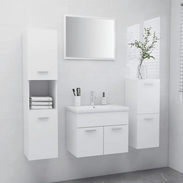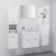 Ta komplet pohištva je sestavljen iz omarice za umivalnik z umivalnikom, nizke omarice, visoke omarice in ogledala. Elegantna omarica za umivalnik z 1 predelkom se popolnoma poda pod umivalnik ter omogoča priročno shranjevanje v kopalnici. Keramičen umivalnik je več kot samo vsakodnevni pripomoček, saj je tudi okras za vaš bivalni prostor. Zahvaljujoč modnemu in sodobnemu dizajnu se bo umivalnik podal k vsakemu dekorju. Ima tudi luknjo za odtekanje vode, če se umivalnik preveč napolni. Visoka omarica ima skupno 5 predelkov in 2 vrata, nizka omarica pa ima 2 predelka. Ti 2 omarici ponujata veliko možnosti za shranjevanje ter dodaten prostor za stvari v vaši kopalnici. Ogledalo se lepo poda k dekorju. Ta komplet kopalniškega pohištva je preprost za čiščenje z vlažno krpo.