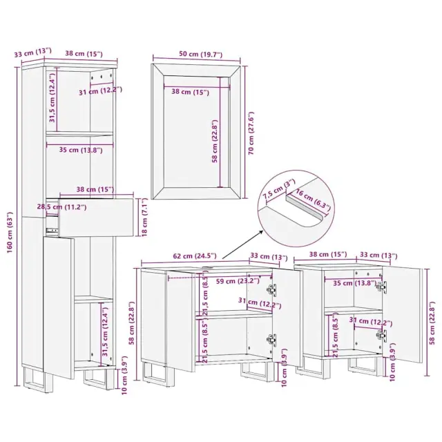Ta moderni komplet kopalniškega pohištva prinaša eleganco in praktičnost v vaš kopalniški prostor s svojim lepim dizajnom in uporabno vsestranskostjo. Vse komponente so iz inženirskega lesa, kar odraža popolno mešanico stila in uporabnosti. Njegov preprost dizajn in moderna estetika sta odlična za sodobne prostore ter nudita veliko možnosti za shranjevanje. Moderna in brezčasna privlačnost tega kompleta obogati vsak prostor ter nudi koristno in stilsko rešitev za organizacijo.