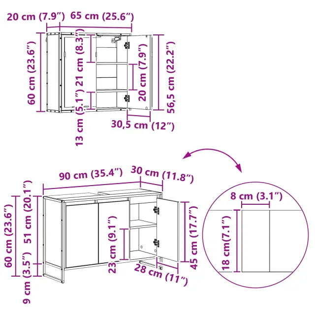 • Premijski materiali: Set je narejen iz vzdržljivega inženirskega lesa in močnega jeklenega okvira, kar mu podaljšuje življenjsko dobo. Ti materiali so odporni na vlago v kopalnicah in ohranjajo njegov videz. Inženirski les je tudi stabilen in ima lepo zrno, ki daje naraven videz.