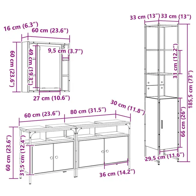 • Vsestranski komponenti: Ta garnitura vključuje ogledalno omaro, omarici pod umivalnikom in visoko kopalniško omaro, ki zagotavljajo odlične možnosti za shranjevanje in organizacijo osnovnih predmetov. Zatična vrata in gladke površine prinašajo eleganten in moderen videz.
