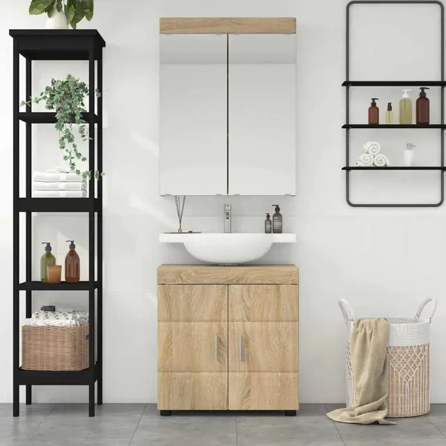 Ta sodoben set kopalniških omaric prinaša eleganten in čist videz v vsak prostor. Zasnovan je za funkcionalnost in še bolj za slog z inženirskim lesom za trdnost. Idealno se prilega različnim okoljem, saj nudi dovolj prostora za shranjevanje ključnih stvari. Gladka tekstura in mat zaključek dodata pridih elegance ter se lepo vključita v vsako kopalnico.
