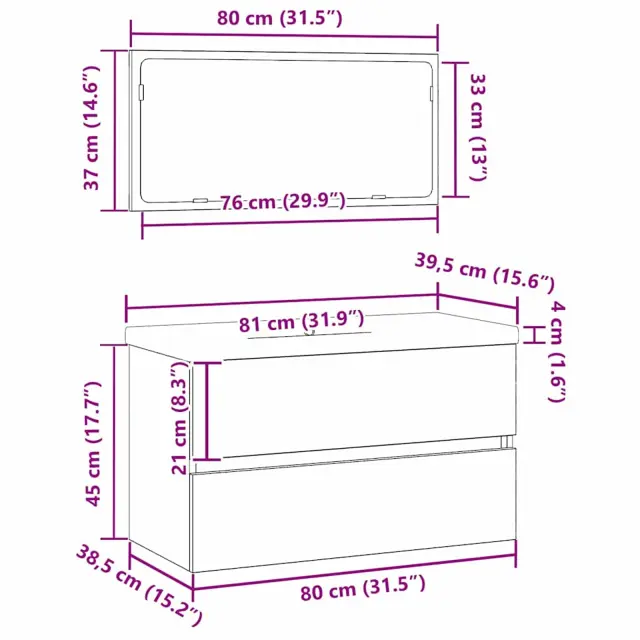• Kompozicija iz inženirskega lesa: Ta kopalniški set je izdelan iz inženirskega lesa, ki je odporen na vlago in zelo močan. Material daje moderno eleganco in hkrati ohranja lahkotno strukturo, tako da je enostaven za prenašanje in namestitev. Inženirski les je znan po svoji vzdržljivosti, kar ga dela odlično izbiro za kopalniške elemente.