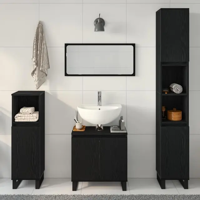 Ta komplet pohištva iz inženirskega lesa je namenjen modernim kopalnicam, ponuja eleganten in minimalističen videz s čistimi linijami in funkcionalnostjo. Njegova pravokotna oblika se odlično dopolnjuje s še tako različnimi oblikami kopalnic in povečuje eleganco prostora. Idealen je za majhne kopalnice v stanovanjih ali večje kopalnice. Ta komplet brez težav povezuje obliko in funkcijo, kar ga dela super izbira za vsakogar, ki želi osvežiti svoj kopalniški dekor.