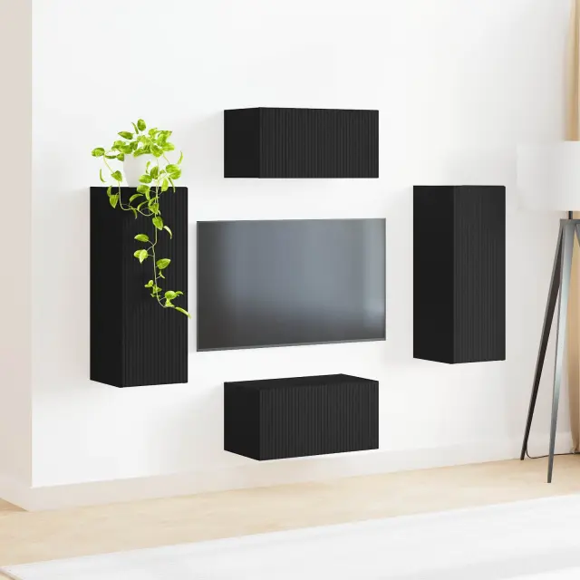 Ta set omaric za televizor spremeni vsako dnevno sobo v stilski in organiziran prostor. Preprosta in funkcionalna zasnova se brez težav vklopi v sodobne notranjosti. Prikazuje in organizira TV naprave, hrani zabavne komponente in še več, medtem ko stenska rešitev ponuja čist in odprt prostor pod, kar povečuje občutek prostornosti.