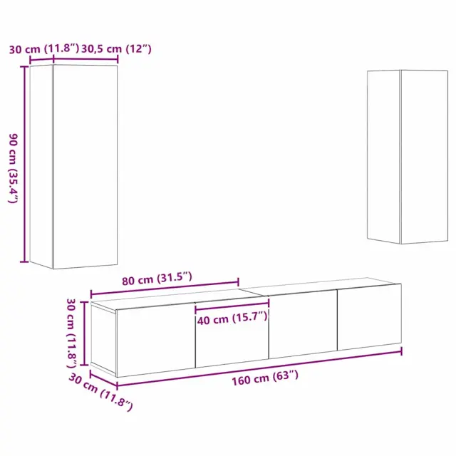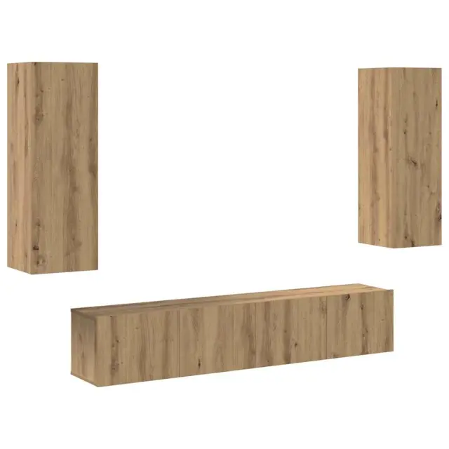 Ta set TV omaric je pametna rešitev za zabavo. Je stiliziran in funkcionalen, s štirimi stenskimi enotami iz kakovostnega umetnega hrasta inženirskega lesa. Povečuje prostor in ponuja praktično shranjevanje za elektroniko in dekor.