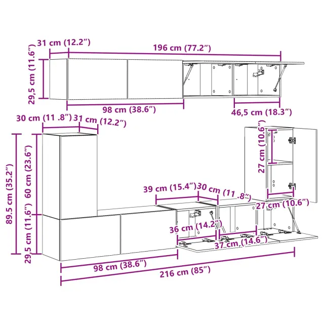 • 2 x Stenska omarica: 98 x 31 x 29,5 cm (D x Š x V)