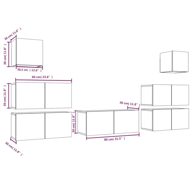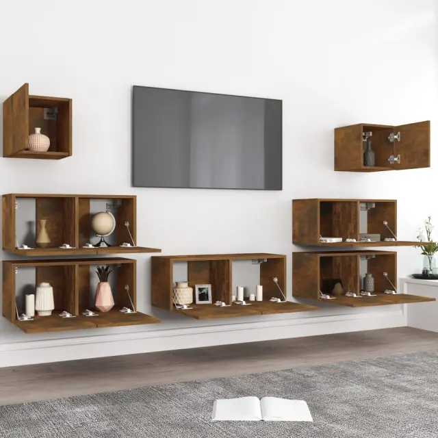 Ta klasični komplet TV omaric s trendovskim, a praktičnim dizajnom je izdelan tako, da bo postal ključna točka vašega prostora. Trden material: Inženirski les se ponaša z izjemno kakovostjo, gladko površino ter močjo, stabilnostjo in odpornostjo na vlago.Veliko prostora za shranjevanje: Komplet TV stojal nudi dovolj prostora za shranjevanje vseh vaših revij, DVD-jev in drugih predmetov, da bodo dobro organizirani.Funkcija namestitve na steno: TV konzola ne zavzame nobenega prostora na tleh. Enostavno jo namestite na steno. Opomba:Vijaki in vtiči za notranjost stene niso priloženi. Poiščite vijake in vtiče, ki so primerni za vaše stene. Če niste prepričani, za pomoč prosite profesionalca. Preberite in natančno sledite vsem korakom v navodilih.Vsakemu izdelku je priložen priročnik za enostavno sestavljanje.Barva: Dimljeni hrastMaterial: Inženirski lesTV omarica (velika): 80 x 30 x 30 cm (Š x G x V)TV omarica (srednja): 60 x 30 x 30 cm (Š x G x V)TV omarica (majhna): 30,5 x 30 x 30 cm (Š x G x V)Paket vsebuje:1 x TV omarica (velika)4 x TV omarica (srednja)2 x TV omarica (majhna) 3120287
