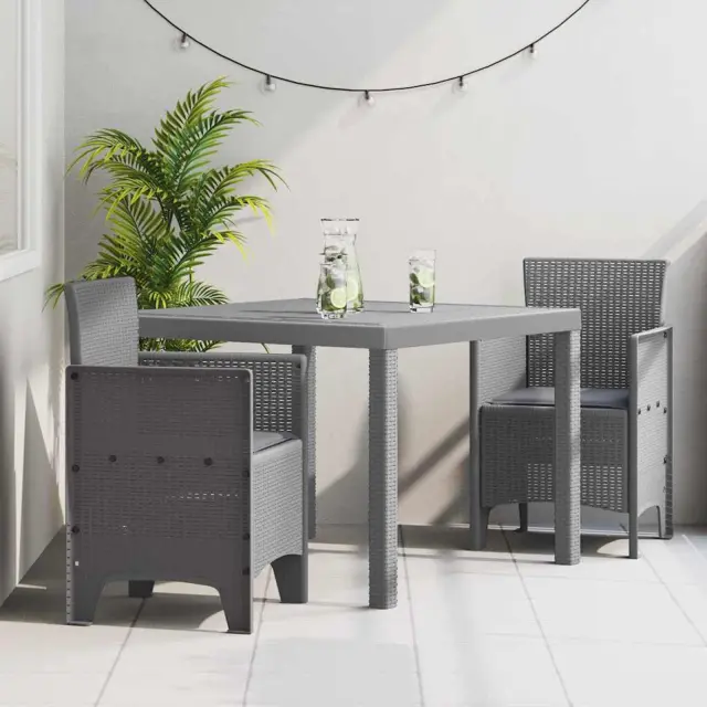 Ta sodobna garnitura za obedovanje na vrtu prinaša sofisticiranost in funkcionalnost v različne zunanje prostore. Popolna za obedovanje na terasi ali vrtu, ta set združuje elegantne linije z teksturirano površino, da zagotovi stilno izkušnjo obroka. Idealna za poletna druženja in obedovanje na prostem, ta set ponuja udobje in priročnost, saj ima blazine za vsak sedež. Kvadratna miza in ujemajoči stoli enostavno dopolnjujejo sodobne zasnove, ponujajoč elegantno, a sproščeno vzdušje za družinske obroke ali družabna srečanja.