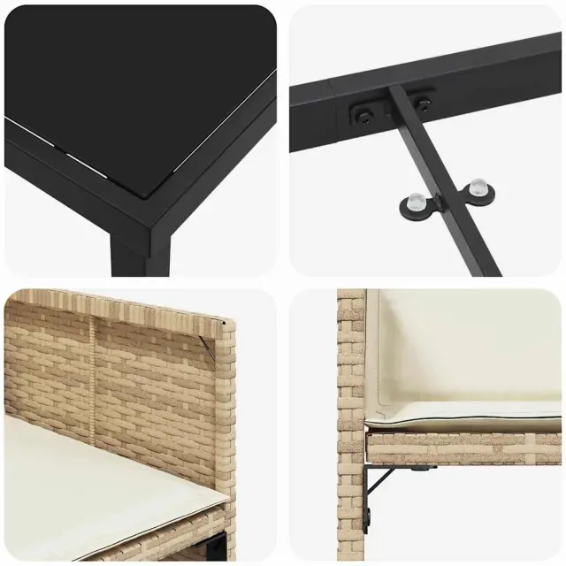 • Material poli ratan: Ta lounge set je narejen iz kvalitetnega poli ratana, ki je lahek, a trpežen, tako da se ne bo zlahka uničil pod UV žarki in drugimi zunanjimi dejavniki. Spominja na naravni ratan, a je veliko lažje za vzdrževanje.