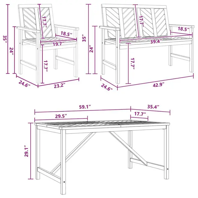 • Popolni komponenti: Set vključuje naslonjala, noge in okvir, vse iz istega visokokakovostnega akacijevega lesa, kar zagotavlja usklajen videz po barvi in teksturi. Ta usklajena izbira lesenih delov naredi celotno obliko udobno in prijetno.