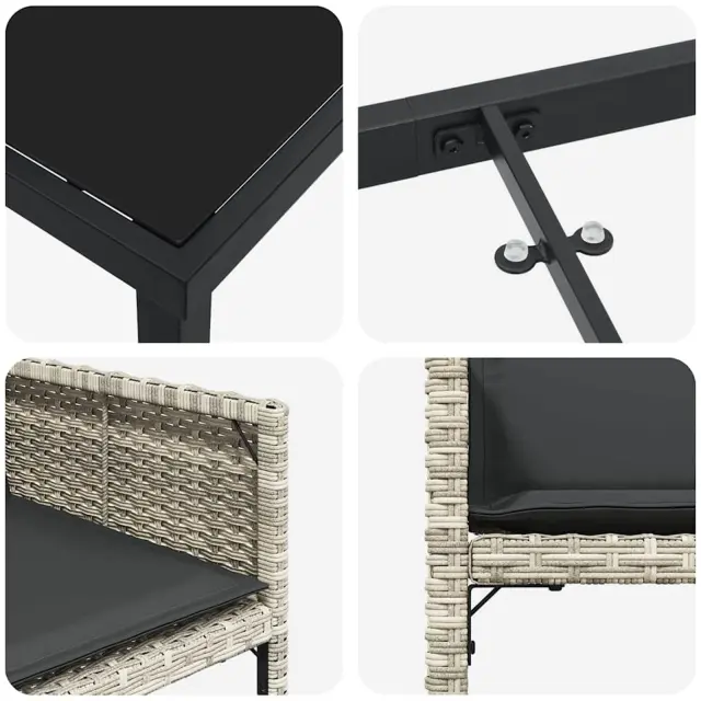 • Vzdržljivi materiali: Garnitura je narejena iz trpežnega poliratana, ki izgleda super in dolgo zdrži. Odpornost na vsakodnevno obrabo omogoča, da zgleda čudovito skozi vse leto. Gladka steklena površina ji doda klasičen pridih in je enostavna za čiščenje. Poleg tega trden jeklen okvir zagotavlja stabilnost, ki se dobro spopada z vremenom.